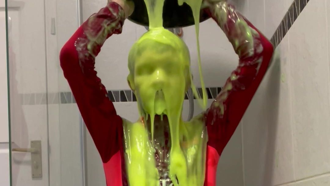 Wearing my football tracksuit top and shorts I pours jugs of gunge all over my head and down my shorts before pouring the rest of the green gunge all over my head before a pie right in my face and doing the same with a whole bucket of yellow gunge all over my head, I then finish with a pie right in my face.
