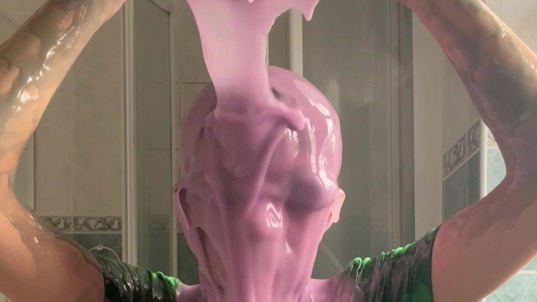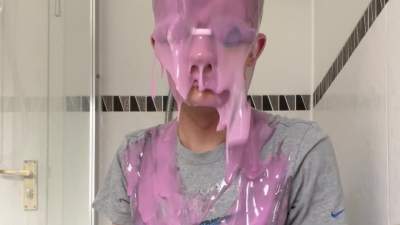 I'm back for more gunge. This time with 2 buckets, 1 grey and 1 purple. I start with the grey gunge, pouring it right over my head before using the purple to cover myself fully before I roll around and have more fun in the gunge bath.