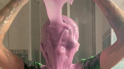 A whole bucket of purple gunge all over my head wearing a grey t-shirt and joggers. I scoop it up and then rub it over myself to make sure I'm fully messy.
