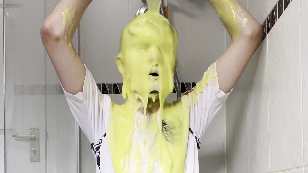 I'm back getting messy in my England shirt and green shorts. I start with a pie right in the face before a big bucket of yellow gunge right over my head, followed by a bucket of pink gunge to fully cover me.